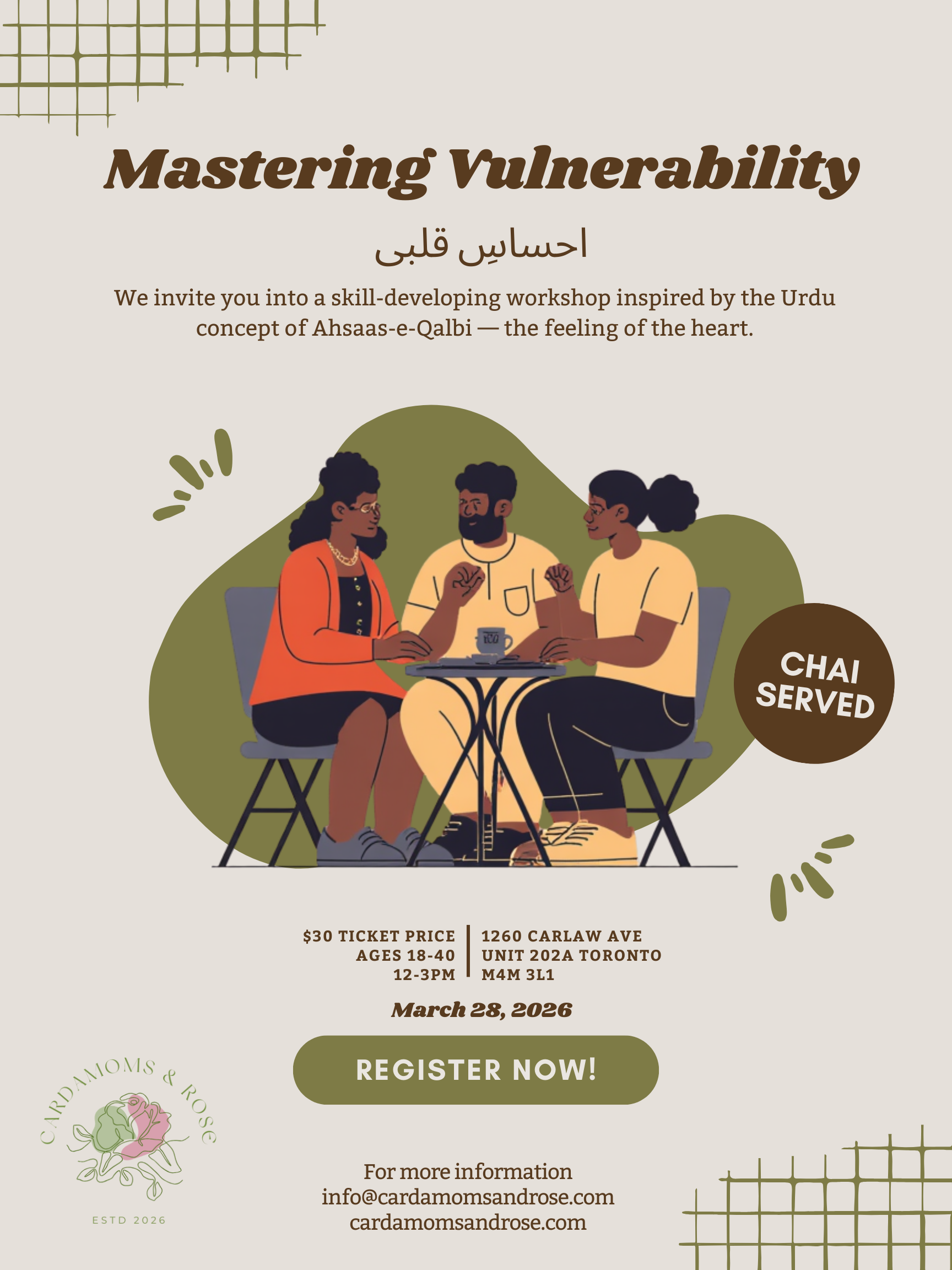 Join us over cardamom chai as we create space for our hearts to meet.